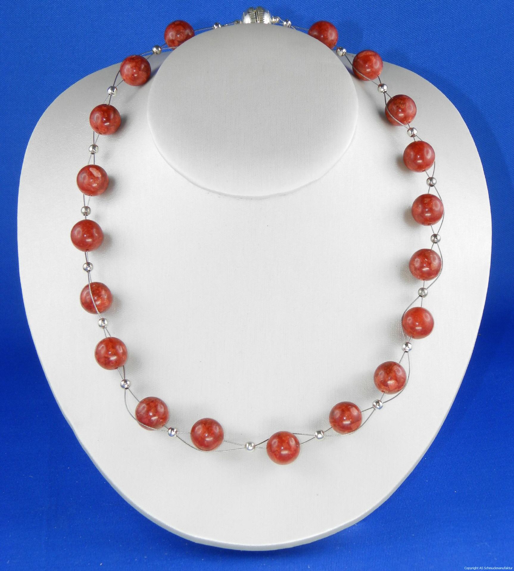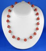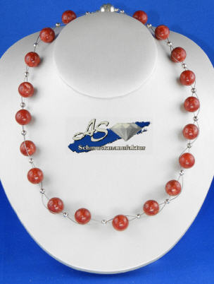 aus 19 Schaumkoralle-Kugeln in 12 mm, silberfarbenen Elementen (alternativ gold) und Magnetverschluß, Länge ca. 45 cm