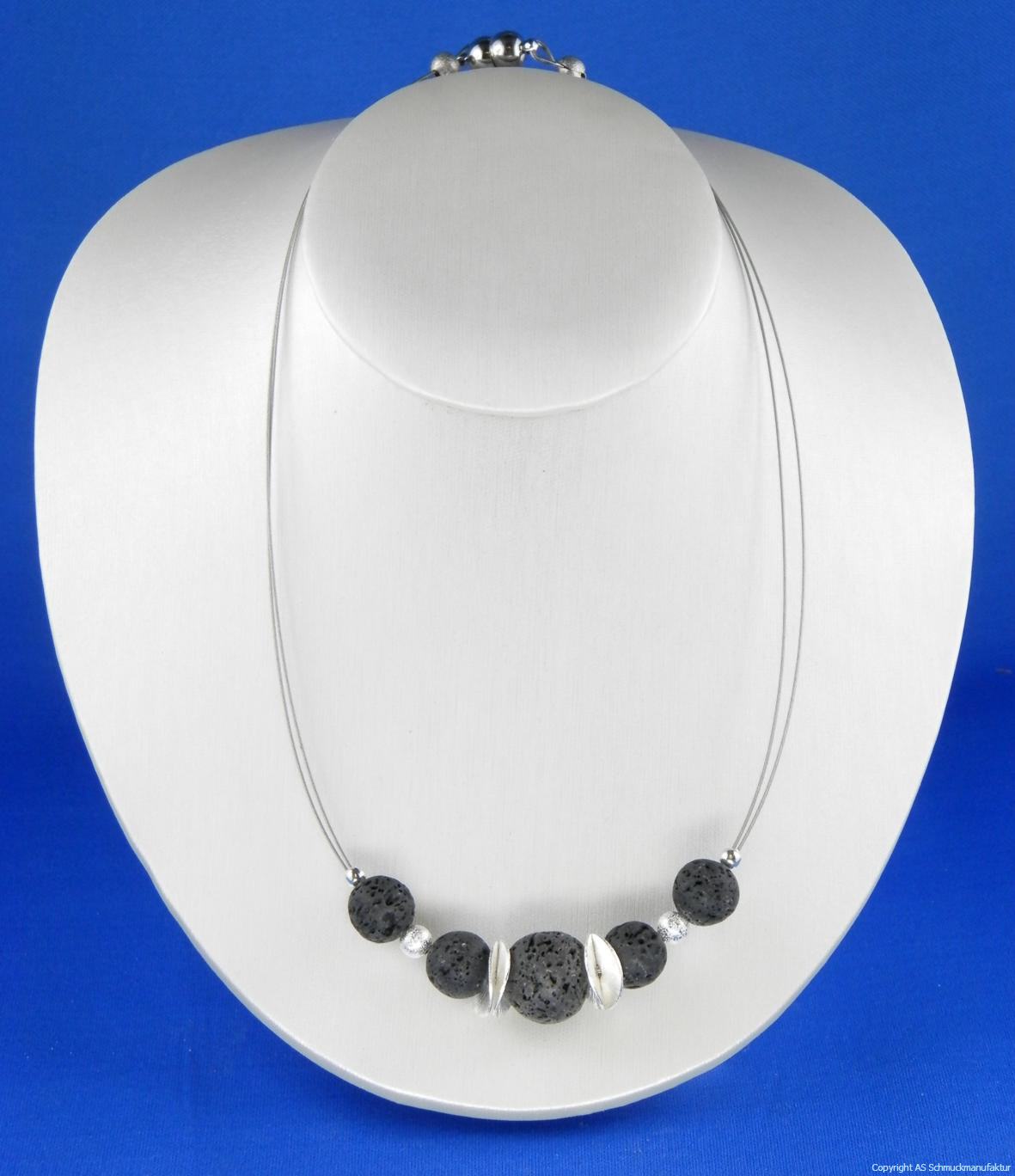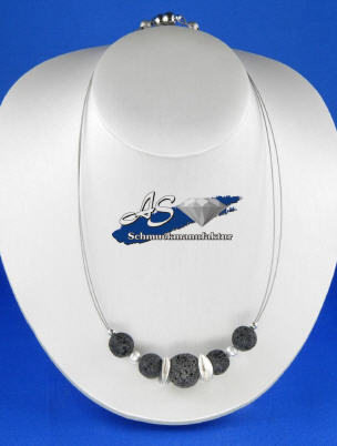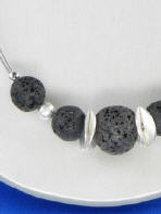 schwarz, auf Draht/Gummmi gezogen, 5 Lavakugeln mit silbernen Elementen (Kugeln und Scheiben), ca. 45 cm lang, mit Magnetverschluß