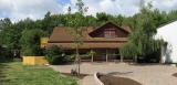 Hinten sehen Sie zwischen Hallentor und der Tannenreihe die zu uns führende Auffahrt! (Doch, Sie können bis zu unserem Parkplatz vorfahren!)