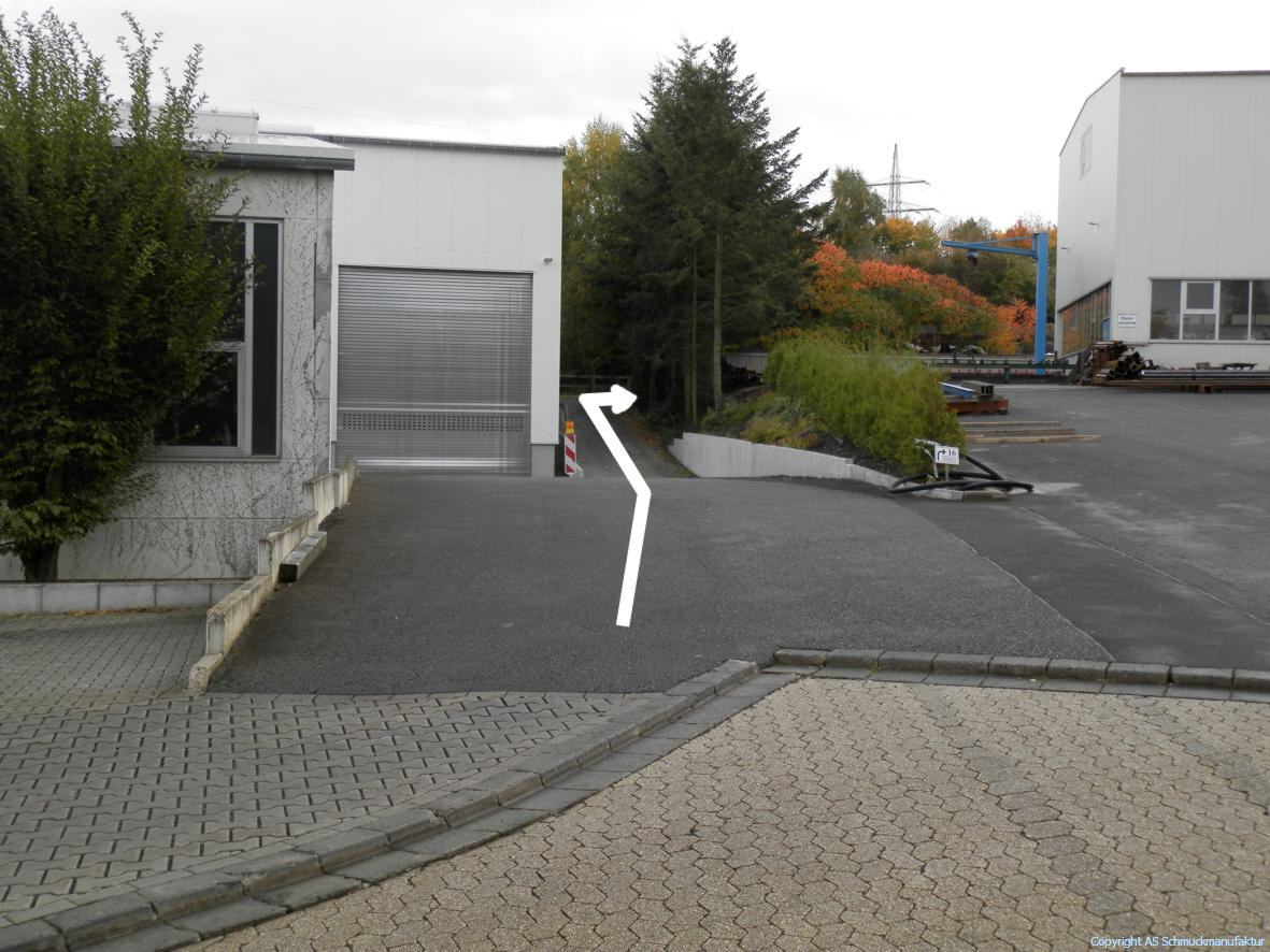 Diese fahren Sie hoch bis zum Ende (Wendehammer), von dort noch 30 m weiter geradeaus in eine gepflasterte Straße, dann links einbiegen.